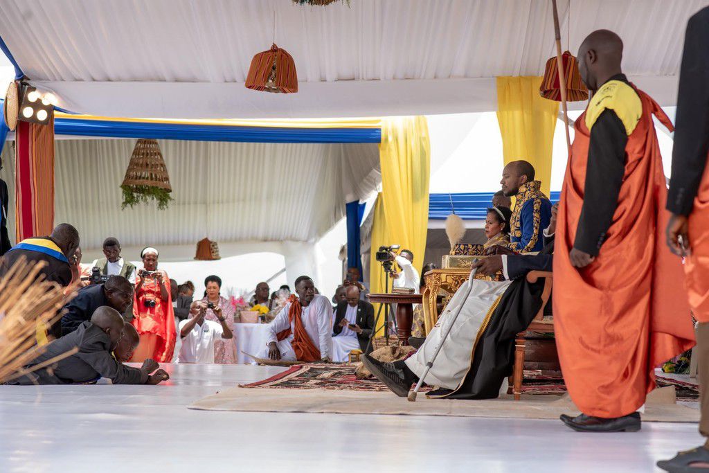Subject prostrate before King Oyo and the Queen Mother Best Kemigisa